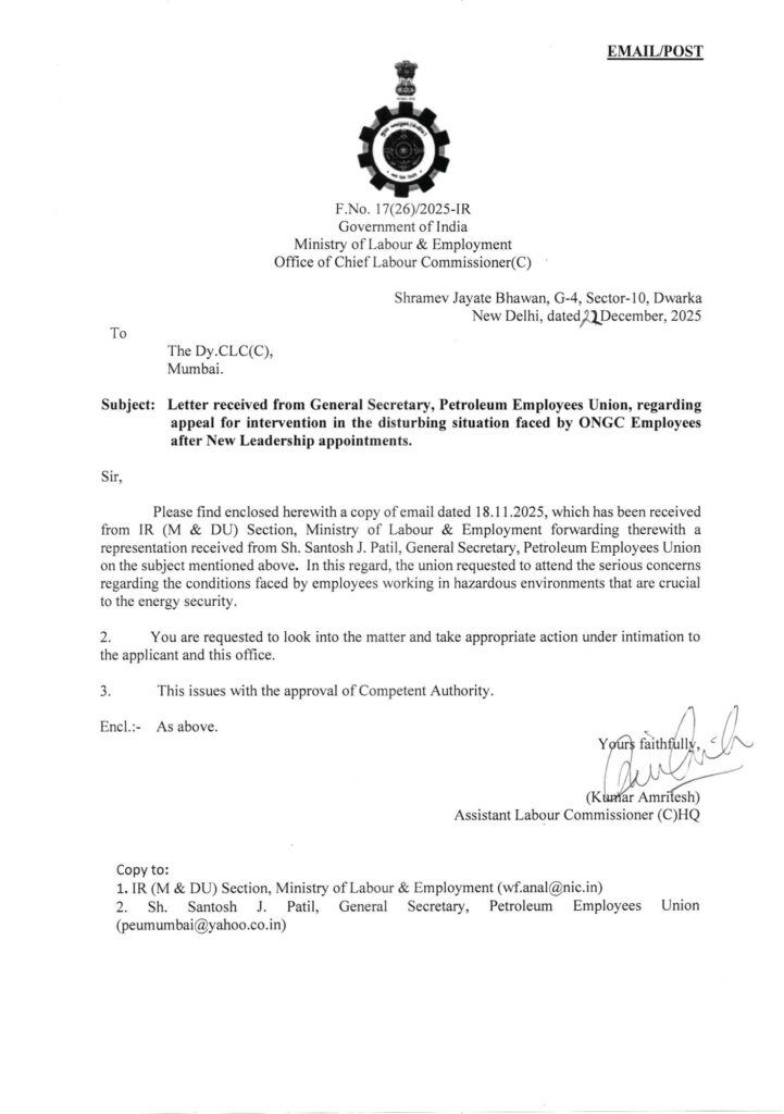 पेट्रोलियम एम्प्लॉईज यूनियन की इस प्रस्तुति का संज्ञान लेते हुए भारत सरकार के श्रम एवं रोजगार मंत्रालय ने इस प्रकरण में आगे की कार्यवाही शुरू कर दी है। इस संबंध में मुख्य श्रम आयुक्त कार्यालय, नई दिल्ली द्वारा File No. 17(26)/2025-IR, दिनांक 22 दिसंबर 2025 को एक आधिकारिक पत्र जारी किया गया है। इस पत्र के माध्यम से संबंधित प्राधिकरणों को उक्त विषयों पर ध्यान देने के निर्देश दिए गए हैं। इससे यूनियन द्वारा उठाए गए मुद्दों की गंभीरता स्पष्ट होती है।