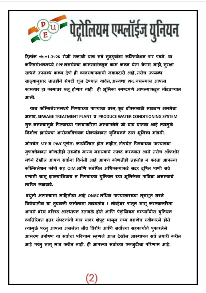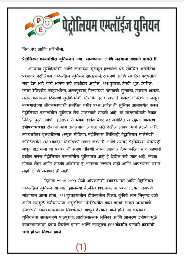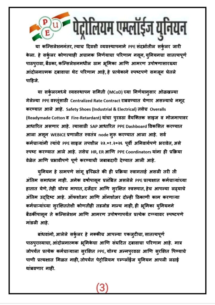 पेट्रोलियम एम्प्लॉईज यूनियन का रुख पूरी तरह स्पष्ट है। कर्मचारियों की सुरक्षा, स्वास्थ्य और कानूनी अधिकारों से जुड़े मामलों में किसी भी प्रकार का समझौता स्वीकार नहीं किया जाएगा। यूनियन इस पूरी प्रक्रिया पर निरंतर नजर बनाए हुए है और केवल पत्राचार तक सीमित न रहते हुए, वास्तविक सुधार होने तक अपना संघर्ष जारी रखेगी।