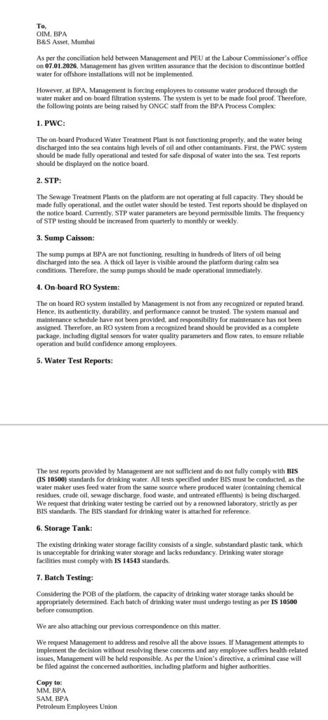 इन सभी मुद्दों के संदर्भ में पेट्रोलियम एम्प्लॉईज यूनियन ने अपने दिनांक 05.11.2025 के पत्र की प्रतिलिपि भारत सरकार के श्रम एवं रोजगार मंत्रालय, पेट्रोलियम एवं प्राकृतिक गैस मंत्रालय, संसदीय स्थायी समिति (पेट्रोलियम एवं प्राकृतिक गैस), INTUC – नई दिल्ली, NFPM – मुंबई, तथा ओएनजीसी के अध्यक्ष एवं मुख्य कार्यकारी अधिकारी (CEO), निदेशक (HR), निदेशक (प्रोडक्शन) और निदेशक (T&FS) को भी भेजी थी, ताकि यह विषय संबंधित सभी प्राधिकरणों तक पहुँच सके।