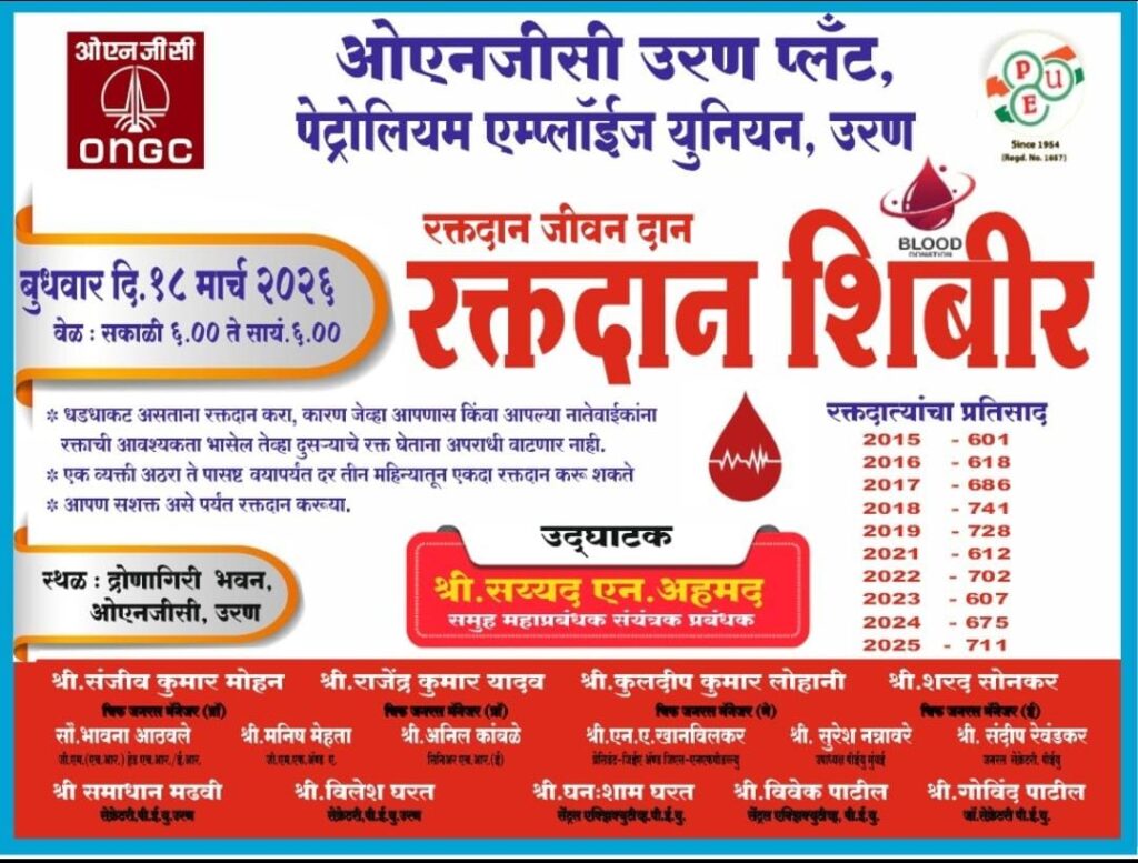 पेट्रोलियम एम्प्लॉईज युनियन ओ एन जी सी उरण सयंत्र दि. 18.03.2026 रोजी रक्तदान शिबिर आयोजित केले त्या शिबिरास आपण भरभरून प्रतिसाद देऊन 722 रक्तदात्यांनी रक्तदान करून आमच्या कार्यावर जो विश्वास दाखवलात त्या बद्दल सर्व कामगारांचे तसेच रक्तदात्यांचे आम्ही सर्वस्वी मनापासून आभार मानतो