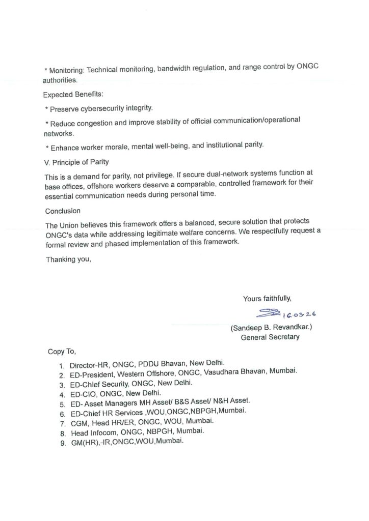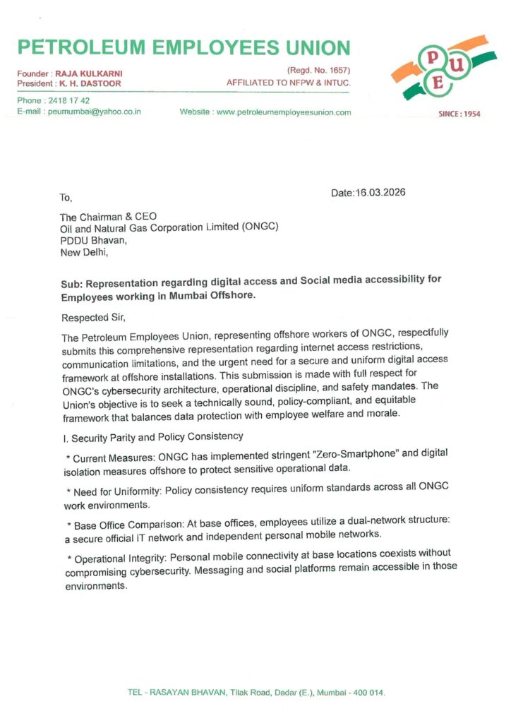 या पार्श्वभूमीवर, या विषयाचे गांभीर्य लक्षात घेऊन पेट्रोलियम एम्प्लॉईज युनियनच्या वतीने मेडिकल इन्चार्ज (मुंबई) डॉ. श्री. सदाशिव शेनॉय साहेब यांच्याशी वसुधारा भवन येथे सविस्तर चर्चा करण्यात आली. कामगारांना प्रत्यक्ष भेडसावणाऱ्या अडचणी त्यांच्या निदर्शनास आणून देत, यावर तात्काळ आणि व्यवहार्य तोडगा काढण्याची आग्रही मागणी युनियनने केली आहे.
