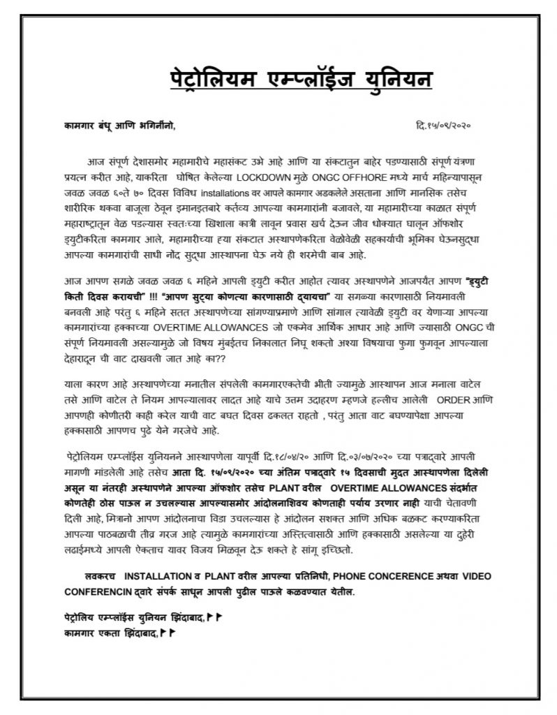 P.E.U Letter 15.09.2020 : Ultimatum regarding due compensation for duties performed beyond prescribed duty period by all Offshore & Onshore Employees of W.O.U.
