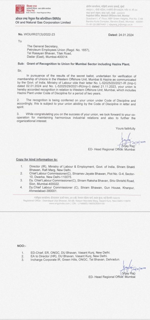 मान्यताप्राप्ती बाबत आपल्या कडे कामगार कायद्यानुसार २ वर्षे व ओ.एन.जी.सी च्या पॉलिसी नुसार १ वर्ष (२+१)असे मिळून तीन वर्षे आपल्याला कामगार हितासाठी काम करायला मिळणार आहेत.