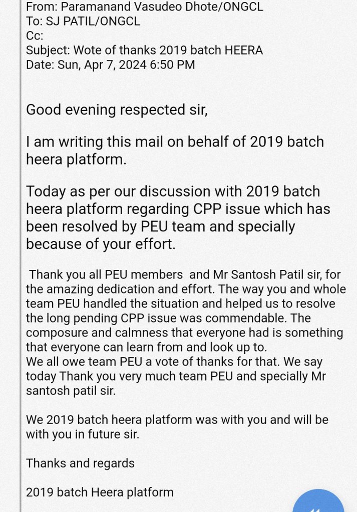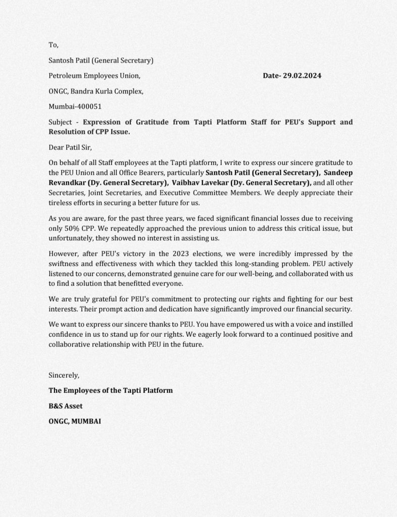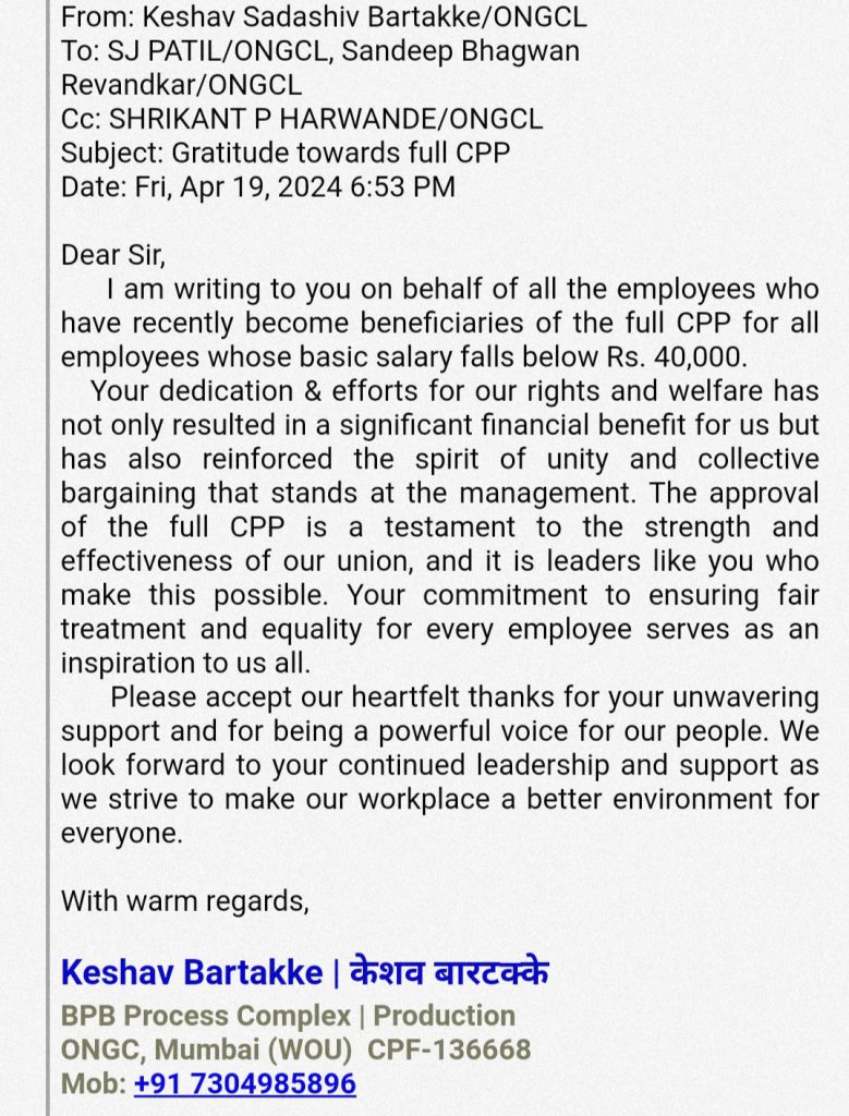 रु.४०,०००/- पेक्षा कमी बेसीक असलेल्या कामगार बंधु / भगिनींना अर्धाच CPP मिळत होता, Petroleum Employees Union ने हा कित्येक दिवसांपासून प्रलंबित असलेला प्रश्न सोडवुन कामगारांना आर्थिक लाभ मिळवून दिला, त्या बाबत अनेकांनी मनापासून PEU चे आभार व्यक्त केले , त्यातील काही आभारपत्रे: