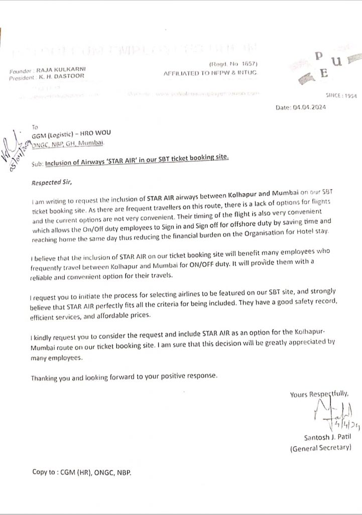 मुंबईहुन महाराष्ट्रातील काही प्रमुख शहरांसाठी फक्त star Air ची विमान वाहतुक सेवा कार्यान्वित आहे. SBT मध्ये Star Air चा पर्याय उपलब्द नसल्यामुळे on/ off करणाऱ्यांना या सेवेचा लाभ घेता येत नव्हता. Petroleum Employees Union च्या सतत च्या पाठपुराव्याला यश आले असुन Star Air चा बुकींग option SBT मध्ये उपलब्द झाला आहे आणि लवकरच SBT च्या site च्या upgradation नंतर तो Option site वर दिसु लागेल व महाराष्ट्रातील विविध ठिकाणांहून , जिथे फक्त star Air ची सुविधा उपलब्द आहे, तिथुन on/off करणाऱ्या कामगार बंधु भगिनींना या सेवेचा निश्चित लाभ होइल.