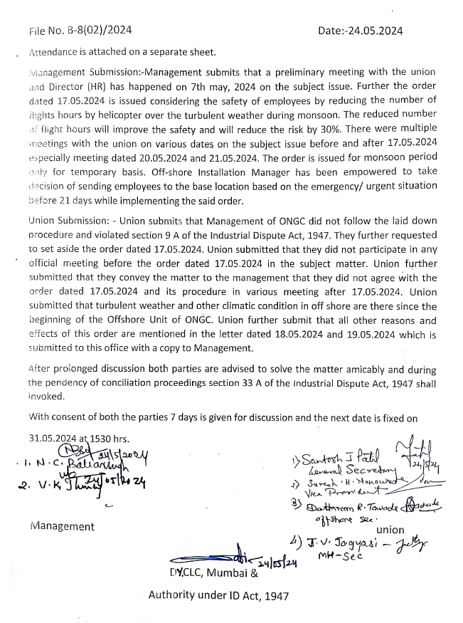 दरम्यान जो पर्यंत सदर प्रकरणावर सुनावणी पूर्ण होत नाही तोपर्यंत व्यवस्थापनाने काढलेली ऑफीस ऑर्डर लागू होणार नसून १४ दिवस ऑन-ऑफ ड्युटी पॅटर्न नुसारच ऑफ़शोअर एम्प्लॉईज कर्तव्यावर जातील अशी भूमिका Dy. CLC यांच्या मध्यस्थीने घेतली आहे. पुढील हिअरिंग दिनांक ३१.०५.२०२४ रोजी संध्याकाळी ठीक ०३:३० वाजता ठेवण्यात आलेली आहे.
