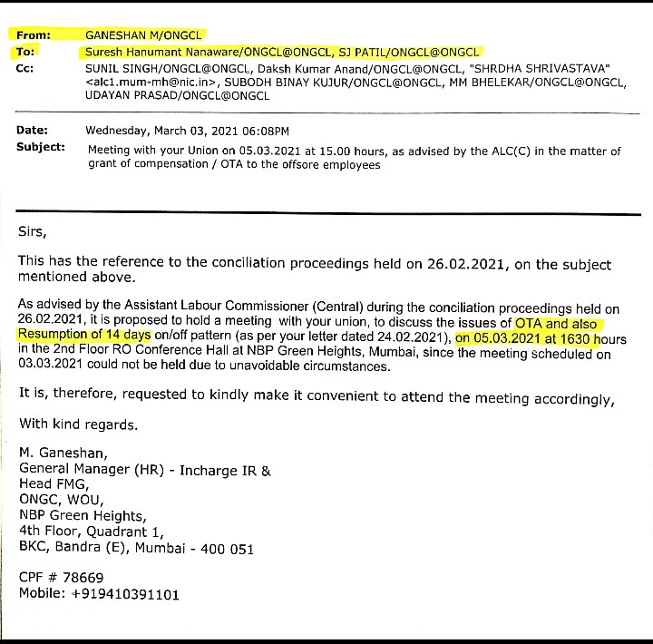 ऑफशोर वरील ड्युटी २८ दिवसांच्या ऐवजी १४ दिवसांवर आणण्याचा जो विषय आपण मांडला होता, त्यावर मॅनेजमेंटने २१ दिवसांच्या ड्युटी साठी तात्पुरता निर्णय दिला आहे व येणाऱ्या काळात १४ दिवसांवर तो आणण्याचे आश्वासन दिले आहे